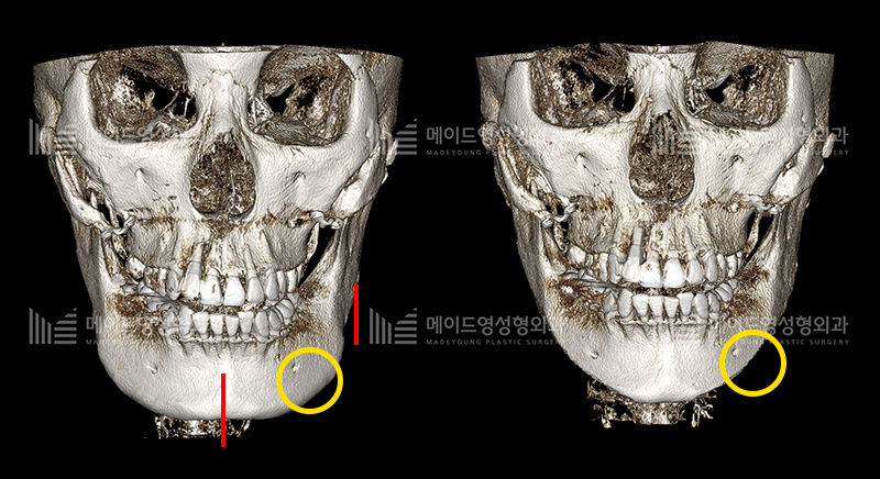 이 분께서는 귀뒤사각턱 후 정면효과를 보지 못하셨다고 하시어 갸름해지기 위하여 추가적 수술을 받기를 원하셨던 분 입니다.
