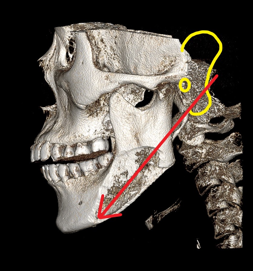 정면에서 턱끝의 중앙과 턱 뒷부분의 중간지점을 표시하면 저 빨간 동그라미 부분입니다